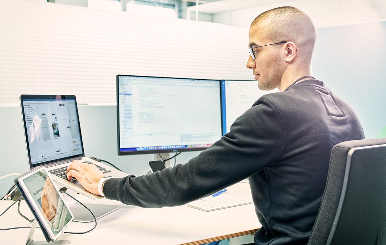 Mit über 70 Softwareentwicklern an den Standorten Berlin, Böblingen, Karlsruhe und Nearshore in Barcelona entwickeln wir seit Jahren erfolgreich für unsere Kunden passgenaue Lösungen für individuelle Fragestellungen. Dabei arbeiten wir bevorzugt mit agilen Entwicklungsmethoden – virtuell im Zusammenspiel über die Lokationen hinweg und in unserer „DevArea“ in Böblingen.