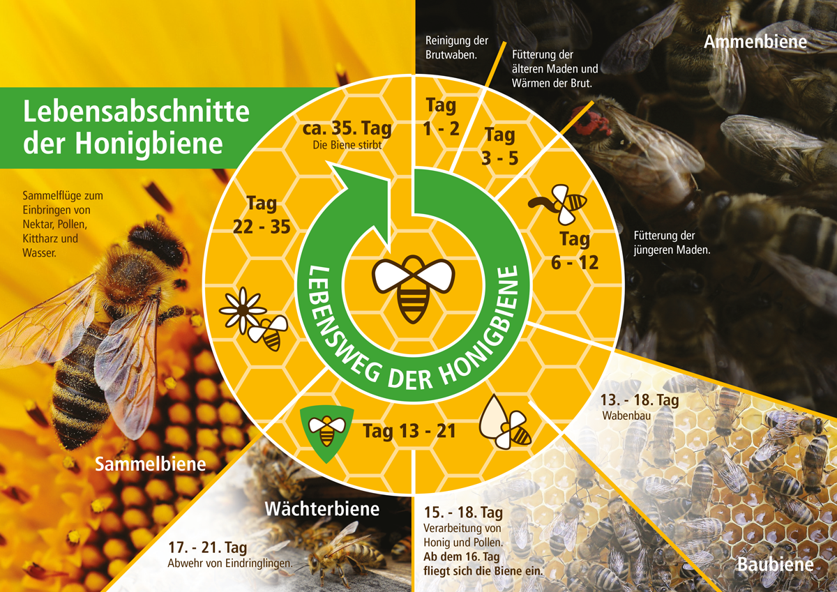 Jede Biene erfüllt in ihrem Volk unterschiedlichste Aufgaben. Sie beginnen als Putzbienen und reinigen die frischgeschlüpften Wabenzellen. Dann werden sie zu Ammenbienen und füttern die Larven und die Königin, anschließend werden sie zu Wächterbienen und sind für die Verteidigung des Bienenstocks zuständig.