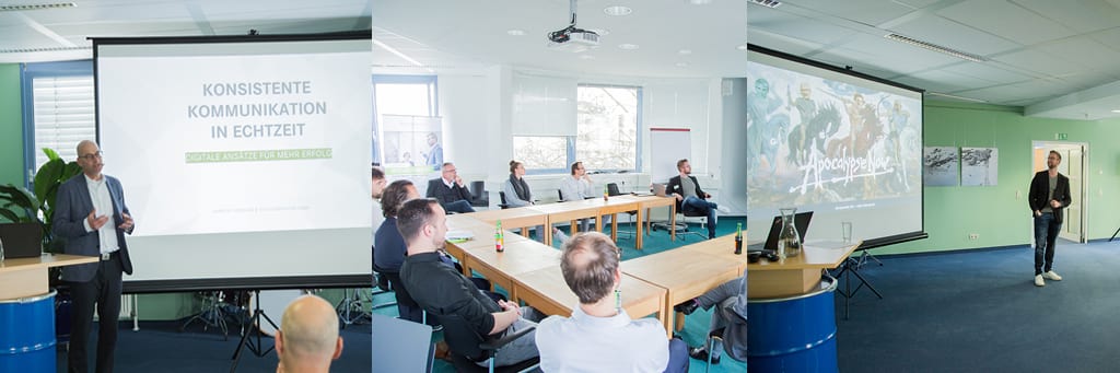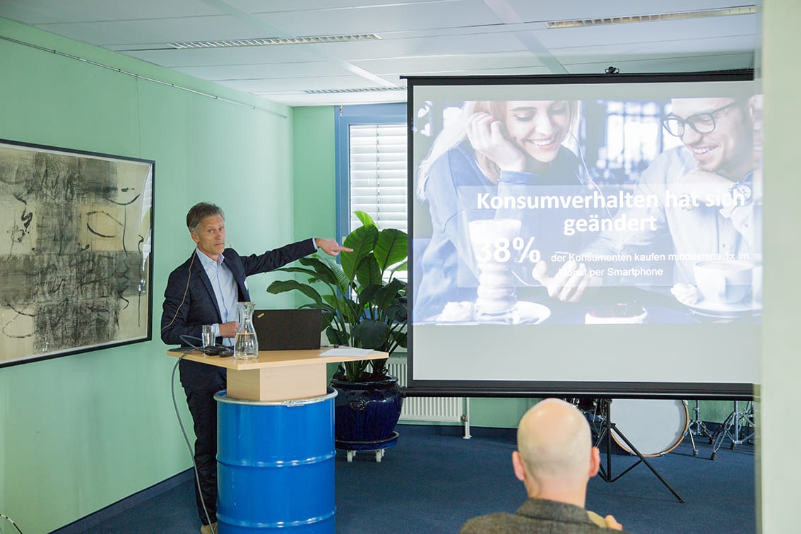 Den Abschluss dieser Vortragsreihe bildete Udo Harwardt von Shopware. Wie der Titel „Die digitale Apokalypse und Tom Hanks“ mit E-Commerce zusammenpasst, veranschaulichte Udo Harwardt in einer sehr bildreichen Präsentation. Unser größtes Problem ist, dass wir Menschen nur linear denken, während die Technologie sich exponentiell verbreitet.