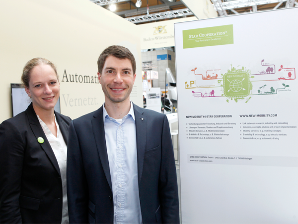 Die meiste Zeit der Messewoche verbrachte Carolin Stickel jedoch am STAR-Stand im Rahmen der MobiliTec, dem Mobilitätszentrum des zweiten Messeschwerpunkts Integrated Energy. Dort bildeten die Experten für New Mobility gemeinsam mit ihrem neuen Partner Fraunhofer IAO und 42 weiteren Ausstellern aus dem Ländle den Baden-Württemberg-Pavillon und präsentierten mehr als 3.000 Fachbesuchern, darunter zahlreiche internationale Wirtschaftsdelegationen, ihr Portfolio rund um E-Mobilität, Car-Sharing und intermodale Mobilitätslösungen. Auch die Politprominenz überzeugte sich vor Ort von der Leistungsfähigkeit der Innovationsfabrik Baden-Württemberg, darunter der EU-Kommissar für Digitale Wirtschaft und Gesellschaft Günther Oettinger und der baden-württembergische Landesminister für Finanzen und Wirtschaft Nils Schmid.