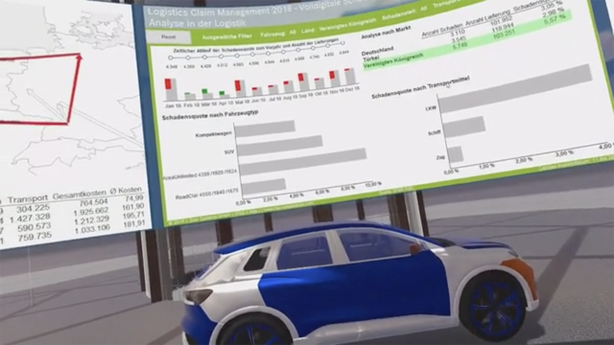BI und VR schaffen mit ihrer kombinierten Art des Reportings Transparenz in der Logistik. Modelle von Fahrzeugen oder anderen Transportgütern visualisieren Kennzahlen wie Schadensquoten, Schadenskosten oder Gesamtkosten, die sich aus verschiedenen Faktoren ergeben, und erweitern so herkömmliche Datenreihen und Dashboards. Das konkrete Fallbeispiel der VR4BI-Anwendung erläutert die Vorteile von VR im Business-Alltag sehr anschaulich.