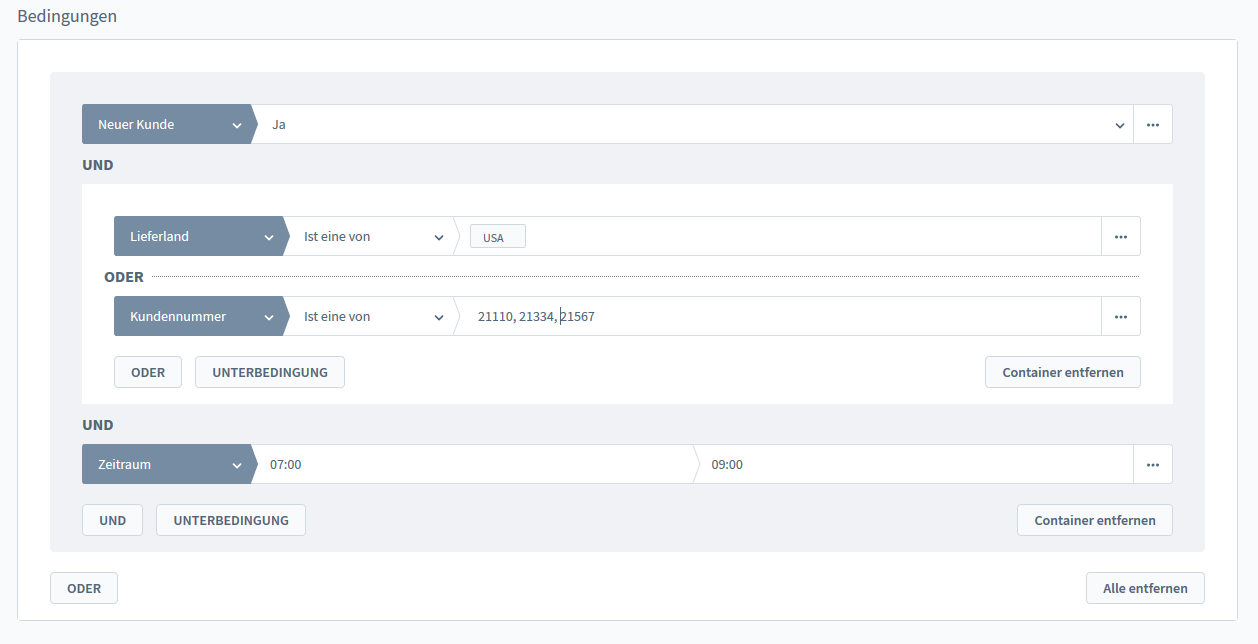 Hier ist weniger technische Erklärung nötig, diese Funktion ist einfach fantastisch. Sie können in Shopware Regeln für Zahlungsarten, Versandkosten, Preise etc. anlegen.
