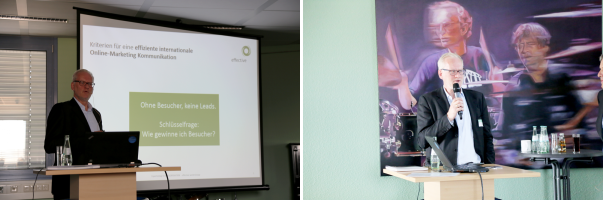 Hermann Bareis, CEO der Online-Agentur effective, sprach über die Kriterien für eine effiziente internationale Online-Marketingkommunikation – insgesamt zehn an der Zahl, von den Merkmalen des jeweiligen Kanals bis hin zu den Erwartungen des Kunden. Dabei gab er einen Überblick über die Komplexität der Online-Welt sowie Anhaltspunkte, wie diese gemanagt werden kann. Eine zentrale Aussage für ihn ist, dass „nicht messbare Ziele keine Ziele sind“. Ein konkretes Beispiel über einen Kunden in der Lebensmittelindustrie in Kanada, für den mit knappem Budget ein Online-Kommunikationskonzept erstellt werden sollte, veranschaulichte seine Ausführungen praktisch.