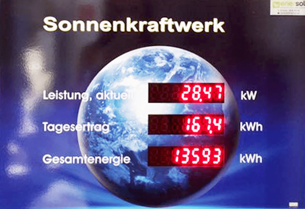 Und damit die Kollegen auch immer wissen, wie es mit dem Leistungsstand gerade aussieht, gibt es im Eingangsbereich einen Monitor für die erbrachte Tages- und Gesamtleistung. Wie man sieht, haben wir nach gut zwei Monaten schon mehr als ein Drittel unserer angepeilten Jahresmenge Strom produziert. Und wir hoffen auf noch ganz viele Sonnenstunden!