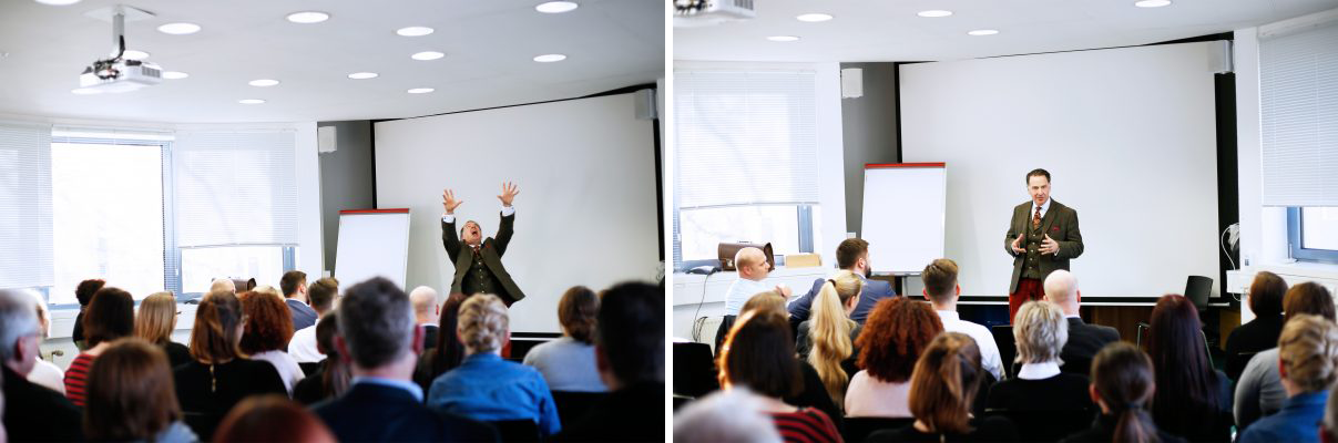 Zum ersten STAR Insight-Impulsvortrag war Johannes Warth extra aus dem schönen Oberschwaben nach Böblingen gekommen. Und so waren seine unterhaltsamen und dennoch zum Nachdenken anregenden Ausführungen von oberschwäbischen Anekdoten und Weisheiten durchzogen. Im Originaldialekt, natürlich. Unterstützt durch Musik, Jonglage-Einlagen und Zaubertricks, machte Warth den geladenen Gästen Mut in allen Belangen. Mut, gegen den Storm zu schwimmen. Sich auch einmal selbst zu hinterfragen. Chancen wahrzunehmen. Vertrauen zu haben. Oder auch neu anzufangen. Dass das auch im Berufsleben funktionieren kann, weiß er aus eigener Erfahrung.