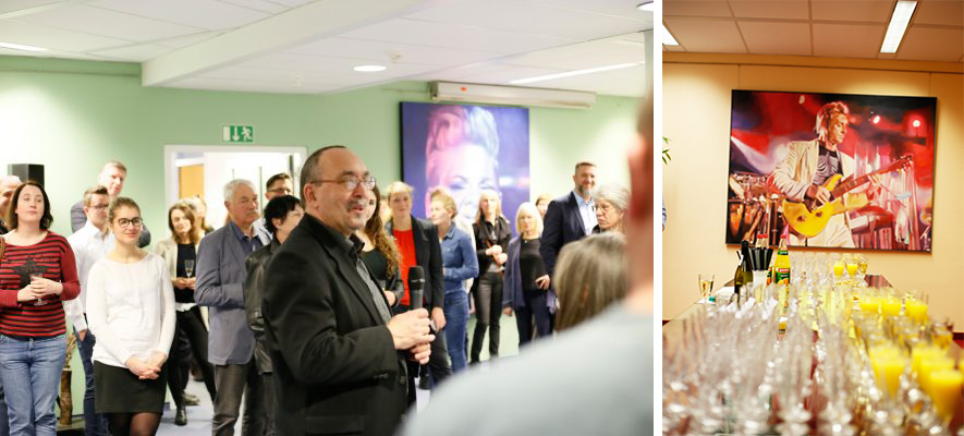 Mit der gerade erworbenen Offenheit für Neues starteten die STAR Insight-Gäste in den zweiten Teil des Abends. Im Grünen Salon erwartete sie der Esslinger Künstler Werner Fohrer mit seiner Ausstellung „Zeitenwende“. Bei seiner Arbeit fragte er sich immer wieder: „Ist das die Wirklichkeit, wie ich sie subjektiv wahrnehme?“ Oder vielleicht doch die objektive Wahrheit. Auf der Suche nach Antworten kombinierte er digitale Fotos und Videos vom Bildschirm mit klassischen Maltechniken und -Materialien. Das Ergebnis ist eine beeindruckende Sammlung von modernen Kunstwerken. Viele seiner Objekte stammen von Rockkonzerten, die er besucht hat. Und so hängt in den Räumen der STAR COOPERATION nun die amerikanische Sängerin Pink in Großformat neben einer völlig unbekannten Spaziergängerin, eingefangen über Google Streetview.